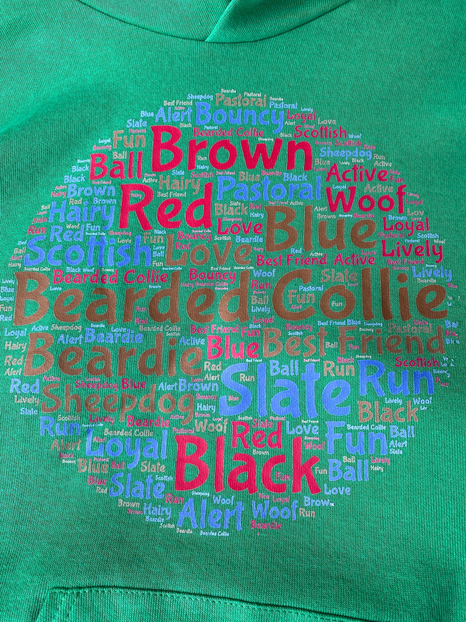 Adult hoodie with Bearded Collie WordArt print on front of garment.