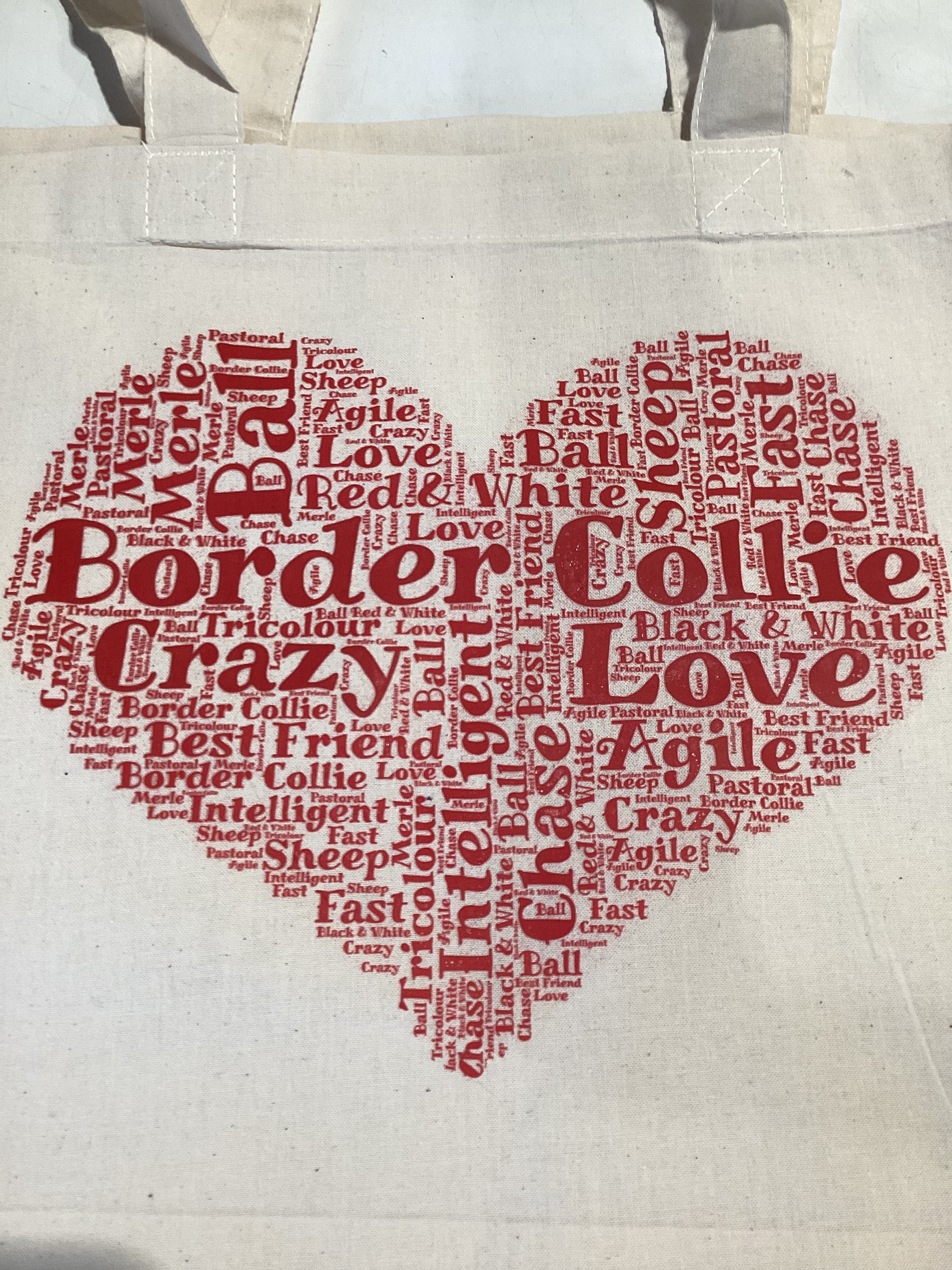 Large cotton reusable shopping bag. Long handles, 18l capacity. With Border Collie themed WordArt design print