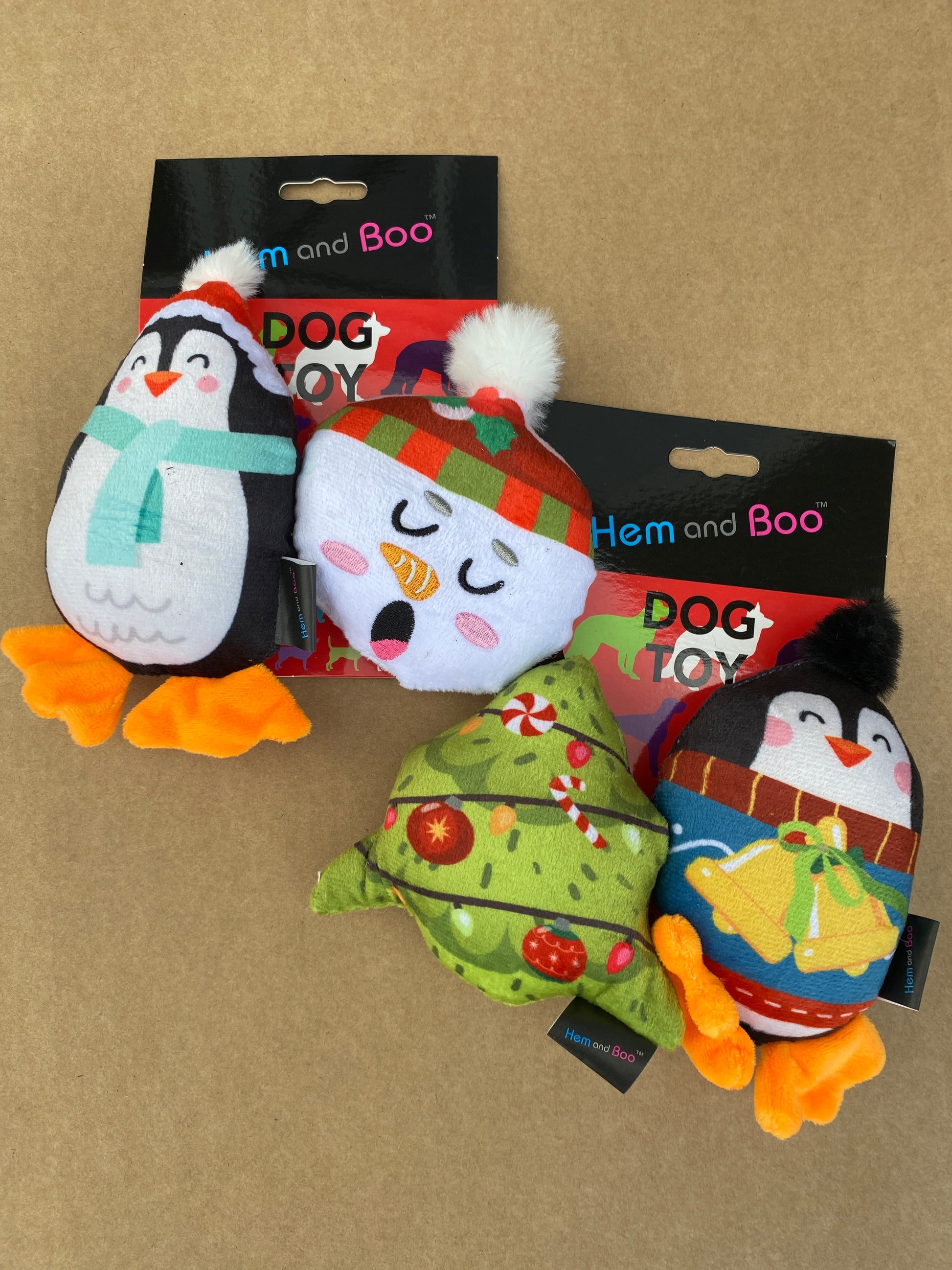 Pack of 2 small plush squeaky toys in festive designs.