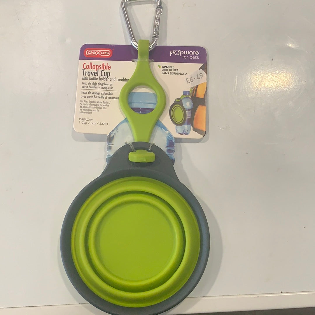 Collapsible dog bowl with bottle holder and carabiner to clip to belt. Holds most types of plastic water bottles