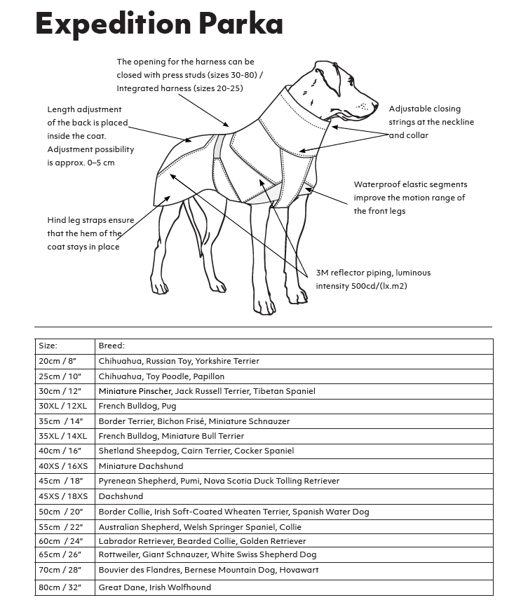The technical surface material of the easy-to-use coat is excellent for even the toughest of games and the fit of the Expedition Parka is designed to allow for an extended range of motion when the dog is running and playing. The water- and windproof soft elastic segments on the front are flexible with the dog’s movements and the neckline, back length and the collar circumference of the Expedition Parka can be adjusted.