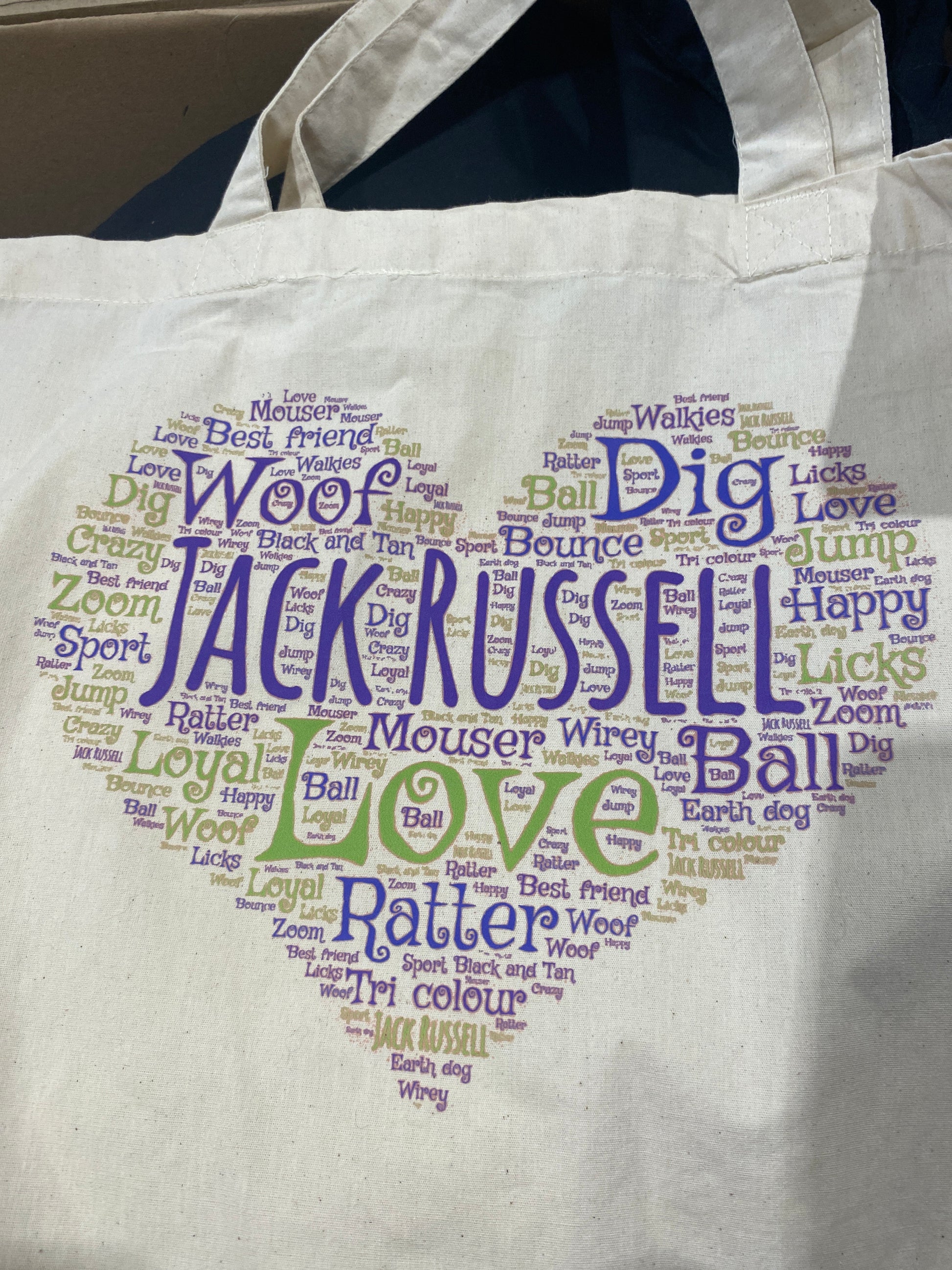 Large reusable shopping bag with Jack Russell Terrier themed WordArt motif.