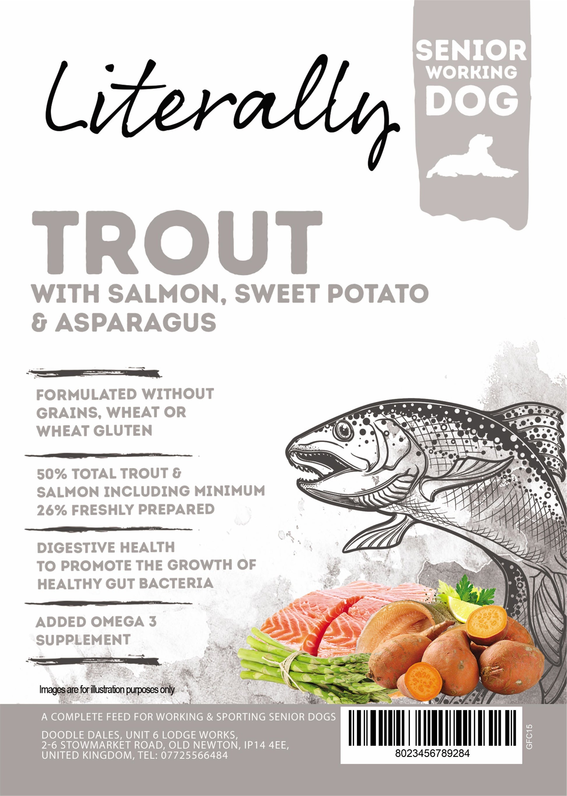 Ingredients: Trout and Salmon 50% (including Freshly Prepared Trout 30%, Dried Salmon 11%, Freshly Prepared Salmon 4%, Salmon Oil 3% and Salmon Stock 2%), Sweet Potato (24%), Potato, Peas (6%), Beet Pulp, Pea Protein, Linseed, Potato, Protein, Minerals, Asparagus (0.3%), Glucosamine(170 mg/kg), Methylsulfonylmethane (170 mg/kg), Chondroitin Sulphate (125 mg/kg), Fructooligosaccharides (FOS 96 mg/kg), Mannanoligosaccharides (MOS 24mg/kg)