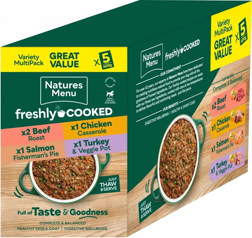 This multipack features a delicious selection of four complete and balanced recipes, each crafted with high-quality meat and vibrant vegetables. Cooked at low temperatures to perfection, these recipes lock in flavour and essential nutrients, providing a week's worth of exciting and wholesome meals your dog will adore.