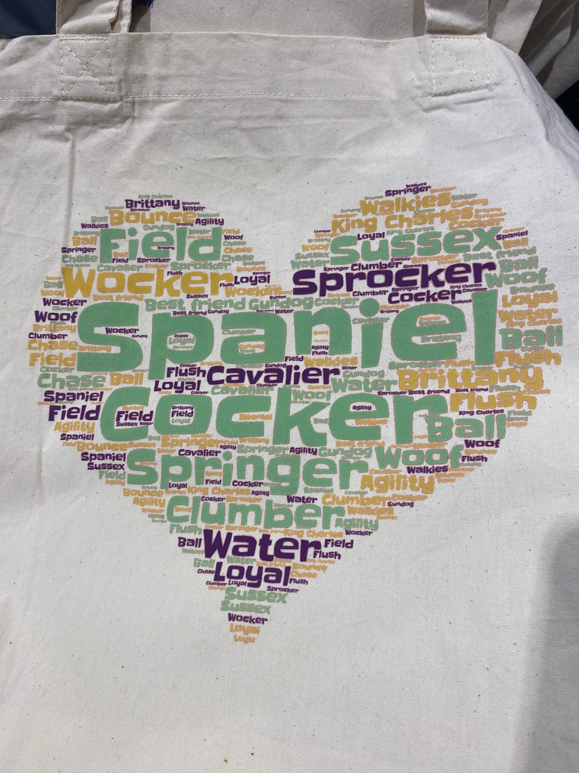 Large reusable shopping bag with Spaniel themed WordArt motif.