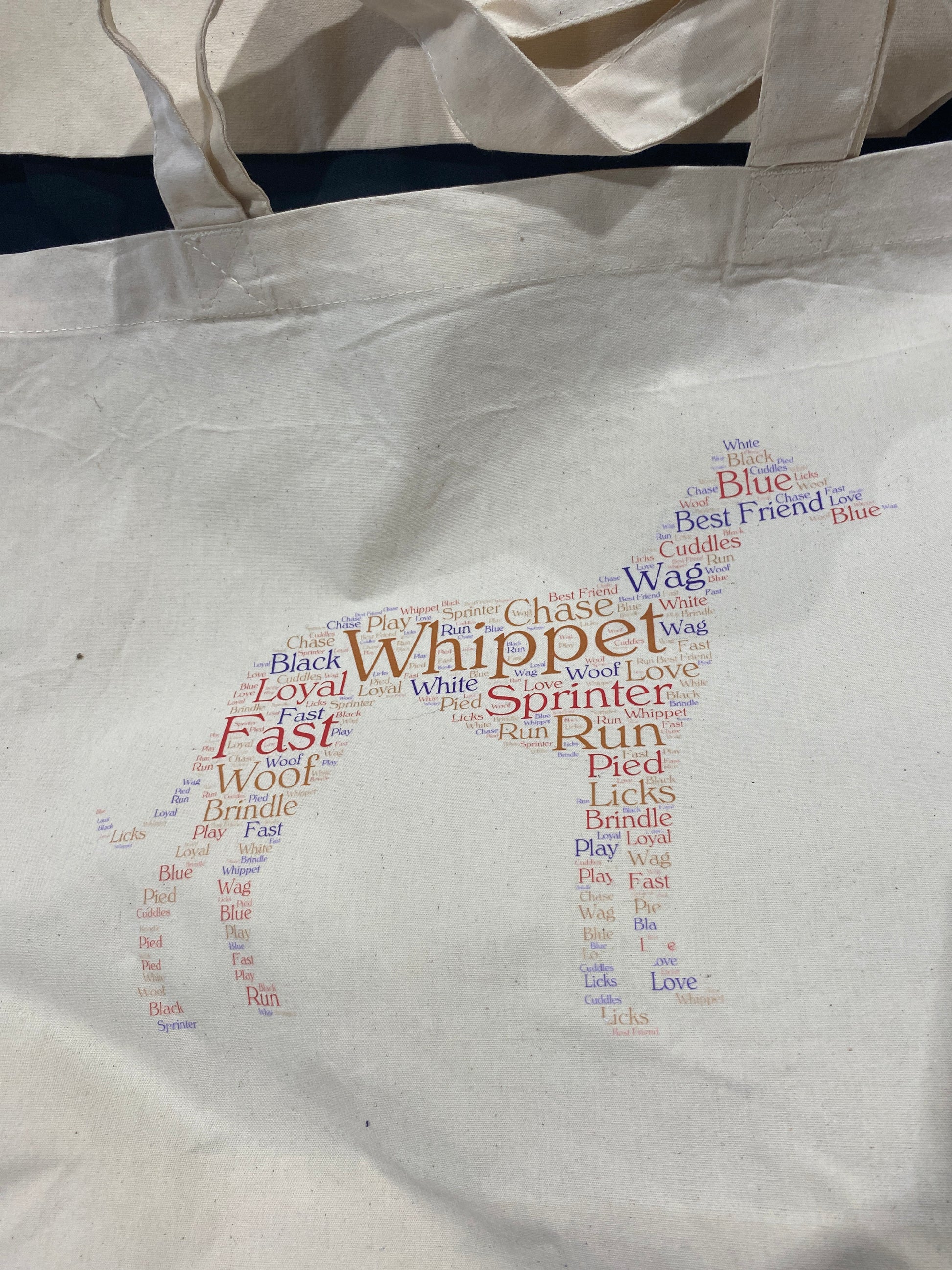 Large reusable shopping bag with Whippet themed WordArt motif.